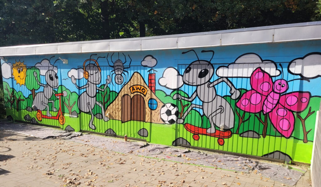 um gemeinsam mit den großen Hortkindern die graue Garagen-Wand in eine neue Attraktion von Bischofswerda zu verwandeln.