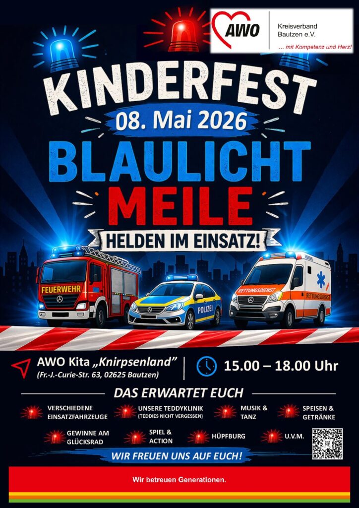 Am 8. Mai 2026 wird die AWO-Kita „Knirpsenland“ in Bautzen-Gesundbrunnen beim großen Kinderfest zur BLAULICHT-MEILE !