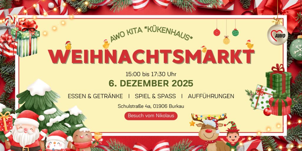 Veranstaltungen & Termine Weihnachtsmarkt im „Kükenhaus“ Burkau 06. Dezember 2025 Kita „Kükenhaus“ Burkau 15:00 - 17:30 Uhr 06. Dezember 2025 Kita „Kükenhaus“ Burkau 15:00 - 17:30