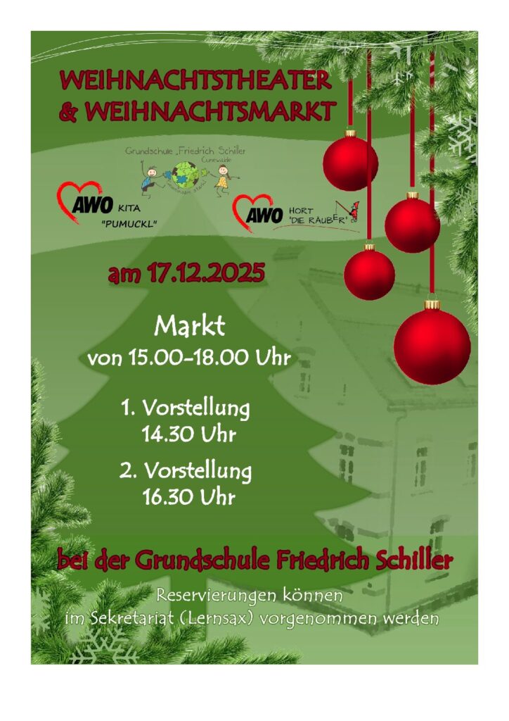 Die AWO-Kita „Pumuckl“, der AWO-Hort „Die Räuber“ und die Grundschule „Friedrich Schiller“ laden für den 17. Dezember herzlich zum Weihnachtsmarkt mit 2 besonderen Theater-Vorstellungen ein: