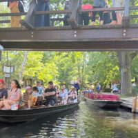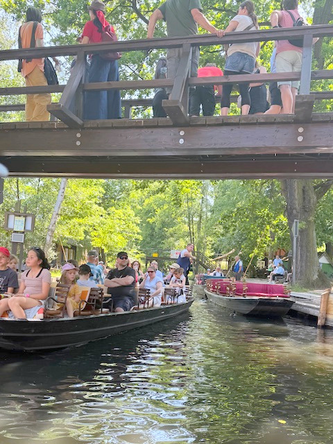 Dort fanden alle trotz vieler Touristen ein Fleckchen im Schatten, von wo aus sie das bunte Treiben bei einem Eiscafe oder leckeren Cocktail genießen konnten. Wieder zurück an Bord, konnte man mit Gesang und auf der Suche nach Schlangenköpfen hoch oben auf den Dächern, nach Heuschobern und sorbischen Trachten regelrecht die Zeit vergessen. Doch die Kaffepause an der Minigolf- Anlage mit regional typischen Buttermilchplinsen verlängerte den Spreewald-Tag noch ein bisschen.